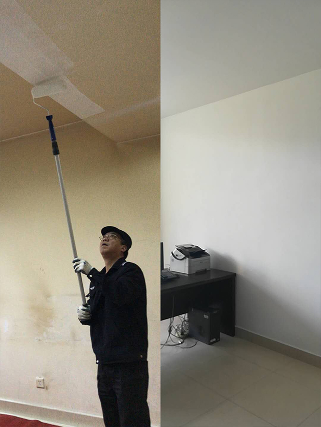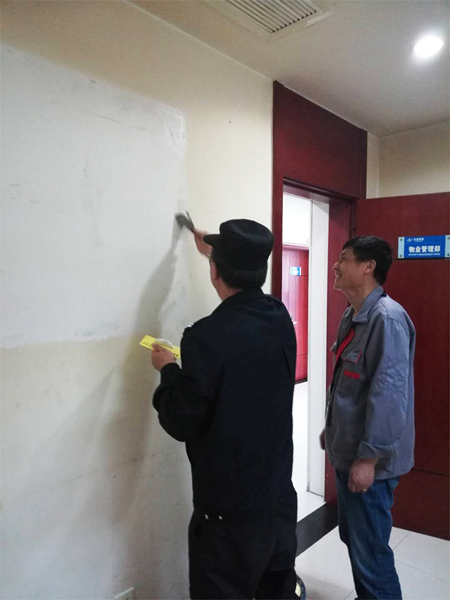 特檢院大樓造好有12年之久,值班室作為人員進出比較繁雜的場所,墻面已經(jīng)失去了原本白色的光澤,整個墻體發(fā)黃。甲方為此很是苦惱,因為重新裝修對于專業(yè)人士來說工作量太小,都不肯接手這份工作。甲方領導找到物業(yè),問有沒有辦法幫他們把這個問題解決一下。物業(yè)主管召集項目幾個管理員經(jīng)過商討,安排保安人員利用休息時間幫著刷刷白。施工準備、購買材料具體工作安排,按部就班有條不紊。雖然都是非專業(yè)人事,但還是第一時間積極的參與到這份工作當中來?粗唵蔚膲γ嫠,難度也是不小的,首先就是墻體打磨,打磨不到一定程度油漆很難粘附上去。膩子干濕度也要適中,最后就是涂油漆,力道輕重直接影響到了墻面的光滑度。經(jīng)過大家一周的辛苦勞動,終于給甲方交出了一份滿意的答卷。雖然非專業(yè),只要動腦筋,干活我們絕對行!
