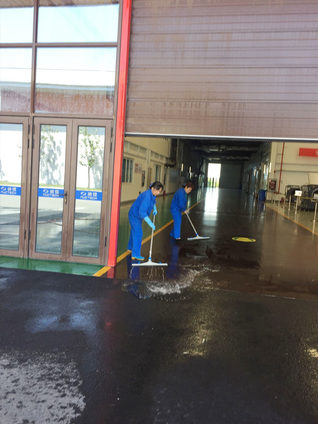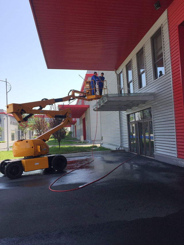 5月3日專項、保潔人員早早的到崗。一人負責開關(guān)消火栓接放水管、一個負責沖洗高處墻面、一個跟著刮洗玻璃、一人負責收沖到車間內(nèi)的水,沖洗外墻工作有序開展。當下午13:00沖洗到5號車間前臺時,甲方值班領(lǐng)導開來了展臂登高車,協(xié)助我們刷洗5號前臺玻璃屋檐。
