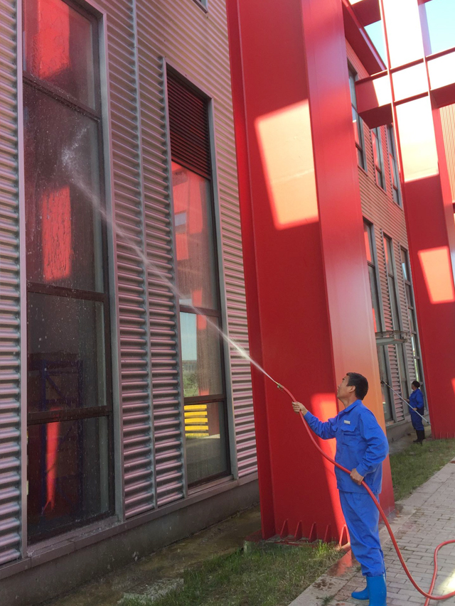 五一勞動節(jié)同方威視放假4天,作為服務(wù)行業(yè)的我們也要利用廠區(qū)放假的時間把平時比較較難清洗的地方清洗干凈。同方威視外墻是鐵皮凹凸墻面,比較容易有灰塵。平時物流區(qū)域叉車、鏟車、大貨車進出頻繁,清洗工作難開展。展廳周圍經(jīng)常有領(lǐng)導和外賓參觀,不方便作業(yè)。4月30日項目負責人制定好沖洗計劃:使用哪處消防水管、需要多少時間、沖洗多少區(qū)域、加班人員名單、登高作業(yè)區(qū)域的安全性等一一做好詳細計劃,遞交甲方負責人審批。經(jīng)過審批同意后方可進行安全沖洗工作。