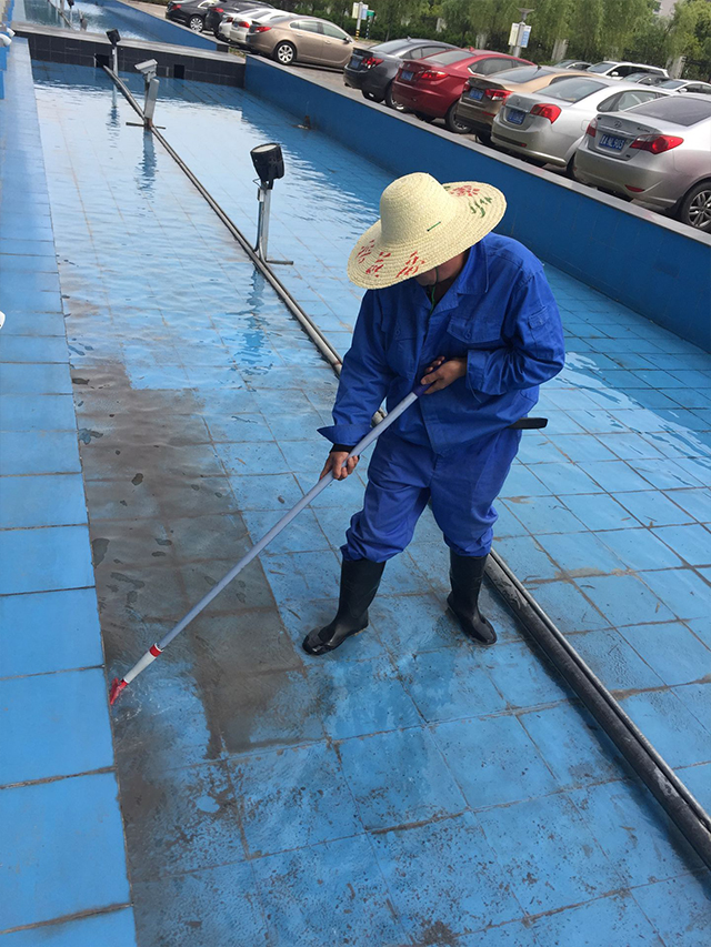 再難再臟的工作我們也要干漂亮!經(jīng)過大家商量討論,排除用機器磨刷(雖然快但不干凈)的方法,還是采用多花功夫和精力人工鏟除污垢,這樣才能恢復(fù)水池的原樣。5月6日早上兩名專項人員腳穿雨鞋、頭戴草帽,下水池鏟除污垢。鏟刀要成45度角,水泥混雜了水垢后綁在瓷磚上面很結(jié)實,必須用力鏟下去,一寸一寸的啃。手上磨出了水泡、更換了3盒刀片,經(jīng)過4天日曬,終于在5月10日把水池底部的污垢鏟除干凈。恢復(fù)了水池碧藍的本色,我們是水池的美容師!