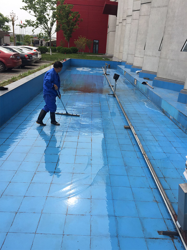 5月初同方威視1號成像車間南外圍水池邊上的竹林移栽別處,3個連環(huán)水池露了出來,甲方?jīng)Q定蓄水啟用水池。因水池長期不用,導(dǎo)致水池底部形成了大量水垢、水泥、污染物,并且屋頂?shù)?個排污口的污水也直接排放該水池中。污染嚴重人員又少,清洗工作比較困難。