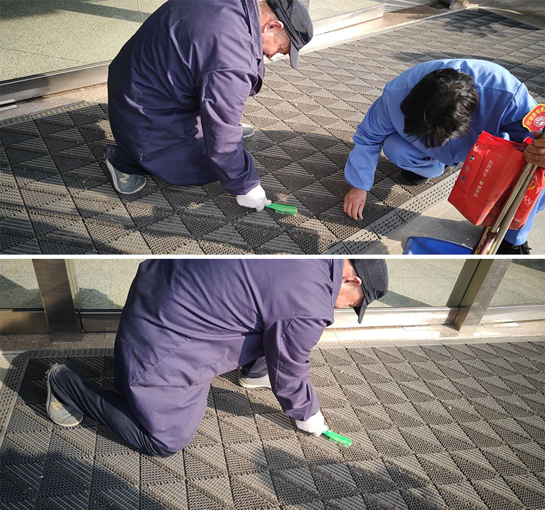 “好醫(yī)管”醫(yī)療事業(yè)部啟東市人民醫(yī)院項目部,5月18日下午,趁著休息天人少,機動師傅計劃把內(nèi)科西門的防滑墊子清潔一下。他拿上保潔工具,叫上大廳里的保潔阿姨,兩個人開始對防滑墊子進(jìn)行徹底的打掃。他們先把防滑墊子移到臺階上,然后用手拍打墊子,使卡在墊子里的灰塵和臟東西全部掉下來,接著阿姨把地上的臟東西先清理干凈,然后兩個人把防滑墊子拖回原地,由于有些絨毛當(dāng)時不能被拍打下來,所以接下來清理絨毛的任務(wù)只能慢慢地解決了。只見他們用手指一點一點地把絨毛從墊子的夾縫間摳出來,還有些害羞的躲在角落里不肯出來的,王師傅只能動用武力——使用鞋刷把它們?nèi)坷蟻。蹲的時間長了,腿有點酸了,他們就站一會兒,休息了一下又接著干。最后終于把那么一大張的防滑墊子徹底清理干凈了?粗敲锤蓛舻姆阑瑝|子,又看看他們又臟又紅的手,真心的為他們的點贊!