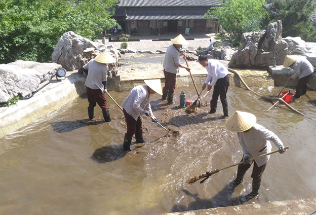 今年春游季和五一期間,鹽湖城游客流量較大,給景區(qū)衛(wèi)生帶來了很多問題。特別是喜泉閣的百業(yè)神谷,疊泉中垃圾甚多,且天氣炎熱,景觀石上青苔較厚。為了避免給景區(qū)帶來負(fù)面影響,也為了給游客一個(gè)良好的游玩環(huán)境,項(xiàng)目部決定對(duì)百業(yè)神谷進(jìn)行全面清洗。