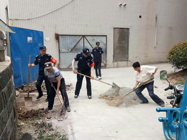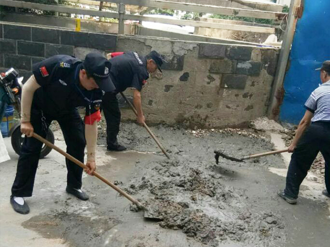 下午兩點,物業(yè)管理人員帶領(lǐng)保安、保潔開始整改。首先,由保潔把地面打掃干凈,然后保安鏟掉多余的泥土,有的保安用鐵鍬,有的保安用尖鎬,相互配合,很快一小片地面就鏟好了。其余的員工一起把黃沙、水泥倒在地面上加入水?dāng)嚢枰幌。拌好水泥再用鐵鍬放入挖好的地面上。最后用木板一點一點的把水泥攤平,整個整改工作持續(xù)了一個多小時。為了安全,我們對硬化好的地面周圍一圈用水泥袋還有路障圍了起來。