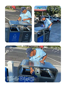 每天清晨,淹城服務(wù)區(qū)保潔大叔都會推著小車來到服務(wù)區(qū)廣場。他總是熟練的從車上取下抹布和水桶。雖然不銹鋼垃圾桶在陽光下閃閃發(fā)亮,但走近看就會發(fā)現(xiàn)上面沾著不少污漬和手指印。
