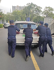 1號崗可是奧體中心車輛進出的關鍵通道,電車停在這里,不僅會引發(fā)交通擁堵,還可能潛藏著安全隱患。徐偉文立即將這一情況上報給了主管。項目經(jīng)理周經(jīng)理得知消息后,第一時間火速趕到現(xiàn)場。當機立斷做出安排,迅速調來4名保安前來支援。這4名保安接到指令后,迅速集合到位。他們分工明確、配合默契,迅速投入到救援行動中。有的保安在電車后面,雙手穩(wěn)穩(wěn)地抵住車身,齊心協(xié)力地推動;有的則在一旁適時指揮,確保推車過程安全有序。而車主則坐在車里,全神貫注地掌握著方向。