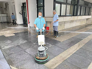 近期,醫(yī)院即將迎來(lái)重要檢查,保潔工作的質(zhì)量直接影響著醫(yī)院的整體形象?祻(fù)樓前的毛石地面因人員往來(lái)頻繁,痰跡遍布,且長(zhǎng)期積累已滲入石材深層,形成頑固污漬。保潔師傅們利用高壓水槍及多功能洗地機(jī)等專業(yè)設(shè)備進(jìn)行深度清潔。工作人員先將清潔劑均勻噴灑于地面,靜置十余分鐘使其充分分解污垢,隨后用刷子重點(diǎn)打磨污漬區(qū)域,再以高壓水槍沖刷,配合洗地機(jī)反復(fù)作業(yè),逐塊淡化殘留痕跡。過(guò)程中,大家分工協(xié)作,不放過(guò)任何死角。與此同時(shí),保潔人員還將周邊區(qū)域納入整體整治范圍,對(duì)垃圾桶內(nèi)外壁進(jìn)行消毒擦洗,更換破損內(nèi)膽,并對(duì)入口處的防滑地毯徹底翻曬、沖刷,去除積塵異味。經(jīng)過(guò)數(shù)小時(shí)連續(xù)奮戰(zhàn),原本污濁的毛石地面恢復(fù)本色,周邊環(huán)境整潔有序,整個(gè)康復(fù)樓前區(qū)域面貌煥然一新,為醫(yī)院迎檢工作奠定了堅(jiān)實(shí)基礎(chǔ)。