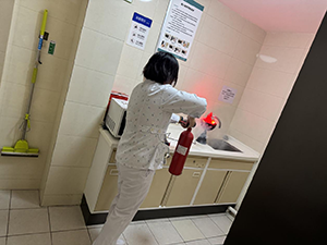 •初期響應(yīng)與疏散:八病區(qū)醫(yī)護(hù)人員迅速分為兩組。一組立即形成首批滅火力量,使用滅火器對(duì)初期火源進(jìn)行撲救;另一組則按照“重病患者先行、行動(dòng)不便者協(xié)助”的原則,與物業(yè)人員共同組織引導(dǎo)病區(qū)內(nèi)的“患者”及“家屬”彎腰低姿、用濕毛巾捂住口鼻,沿著預(yù)定的疏散路線,快速、有序地向安全區(qū)域轉(zhuǎn)移。整個(gè)過程緊張而不慌亂,充分體現(xiàn)了醫(yī)護(hù)人員和物業(yè)人員在日常訓(xùn)練中掌握的疏散引導(dǎo)技巧和臨危不亂的心理素質(zhì)。