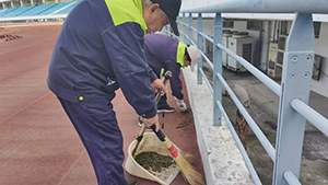 在體育場內跑道與欄桿的銜接之處,不知從何時起,悄然冒出了許多充滿生機的雜草與青苔。它們雖為自然生長,卻與整潔的體育場環(huán)境略顯格格不入。奧體中心保潔團隊發(fā)現(xiàn)了這一狀況,決心為體育場恢復往日的清爽與整潔。