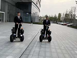 兩位秩序員身著筆挺的黑色西裝,腳踩智能巡邏平衡車,在園區(qū)內(nèi)開(kāi)啟了他們的安保巡查工作。在廣場(chǎng)區(qū)域,他們雙手牢牢把住車把,身姿挺拔如勁松。平衡車的大輪胎在磚石路面上平穩(wěn)滑動(dòng),每一次轉(zhuǎn)向都精準(zhǔn)而流暢。左邊的秩序員目光如炬,時(shí)而快速掃過(guò)玻璃建筑的門(mén)窗,時(shí)而留意遠(yuǎn)處行人的動(dòng)態(tài);右邊的秩序員則專注于周邊車輛的停放情況,兩人配合默契,仿佛為園區(qū)織就了一張無(wú)形的安全網(wǎng)。那平衡車上的警示燈輕輕閃爍,既彰顯著安保的嚴(yán)謹(jǐn),又似在向園區(qū)內(nèi)的人們傳遞著安心的信號(hào)。