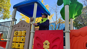 為了讓孩子們能在一個(gè)干凈、安全的環(huán)境中盡情玩耍,保潔人員付出了辛勤的努力。今天,保潔人員魏建明又拎著水桶、帶著抹布來(lái)到了這里。他先是仔細(xì)地檢查了每一個(gè)角落,不放過(guò)任何一處污漬和灰塵。接著,他用濕抹布認(rèn)真地擦拭著攀爬架的扶手、滑滑梯的表面,一遍又一遍,不厭其煩。遇到頑固的污漬,他還會(huì)蹲下身子,用刷子用力地刷洗,直到污漬消失不見(jiàn)。在保潔人員魏建明的努力下,原本有些灰暗的游樂(lè)設(shè)施重新煥發(fā)出了光彩,變得干凈整潔。